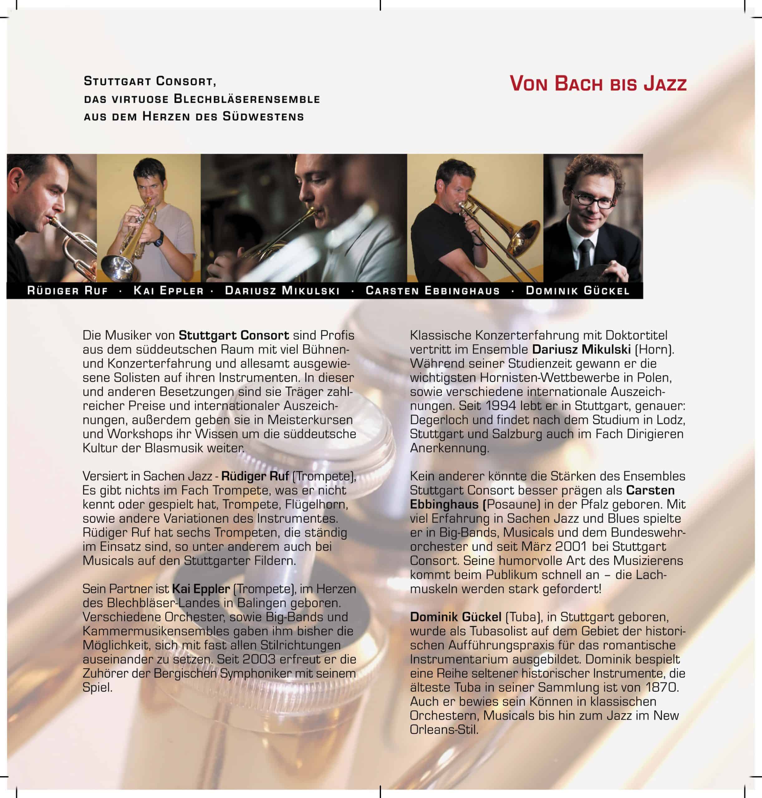 Die Musiker von Stuttgart Consort sind Profis aus dem süddeutschen Raum mit viel Bühnen- und Konzerterfahrung und allesamt ausgewiesene Solisten an ihren Instrumenten. In dieser und anderen Besetzungen sind sie Träger zahlreicher Preise und internationaler Auszeichnungen. Außerdem geben sie in Meisterkursen und Workshops ihr Wissen um die süddeutsche Kultur der Blasmusik weiter.